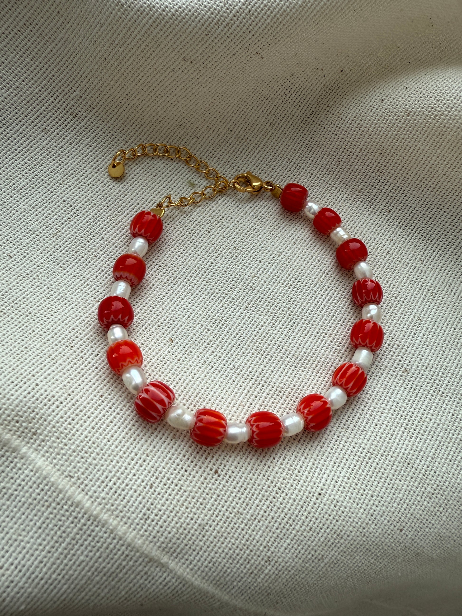 Deze geweldige selfmade armband geeft extra kleur aan je outfit. Gemaakt met glaskralen en zoetwaterparels.