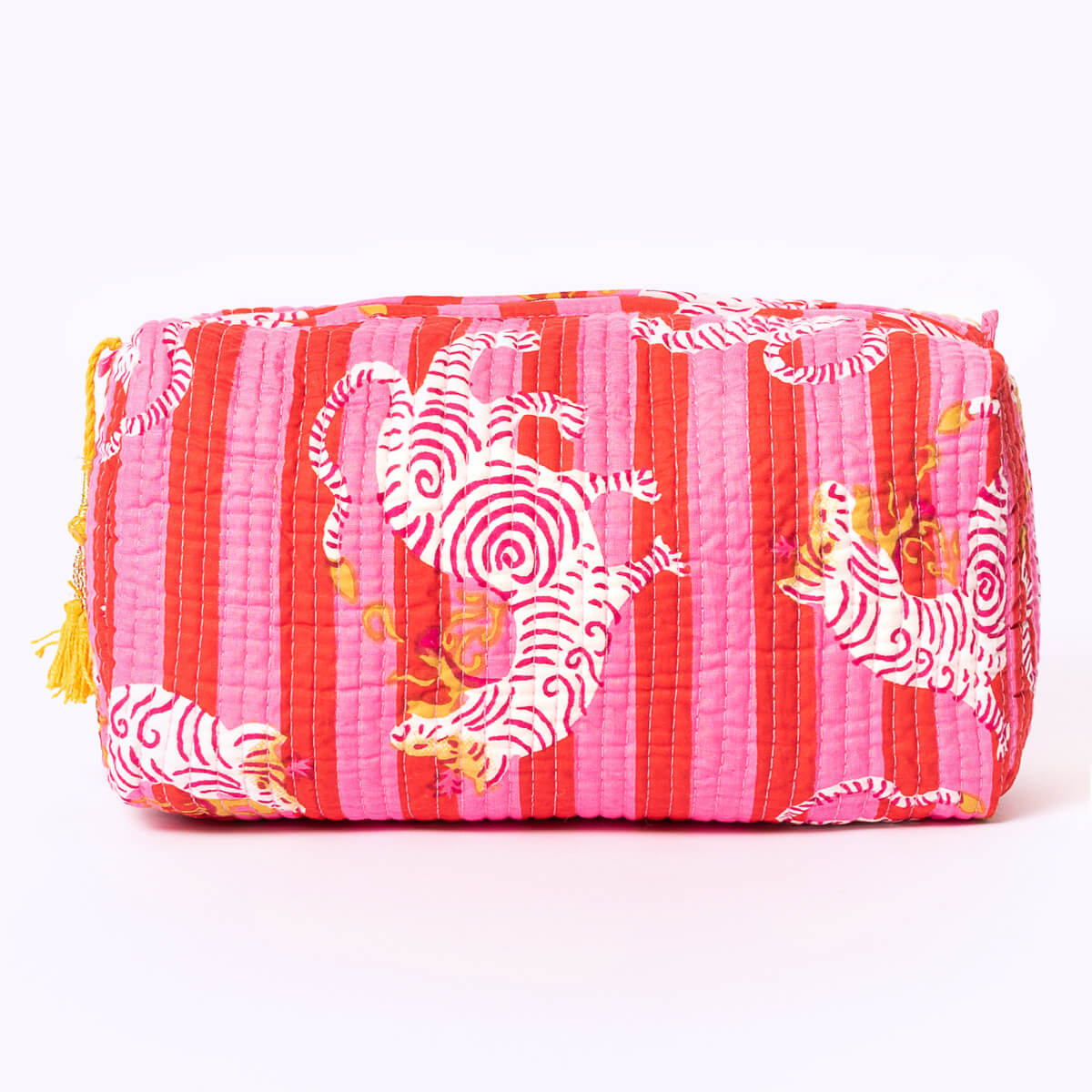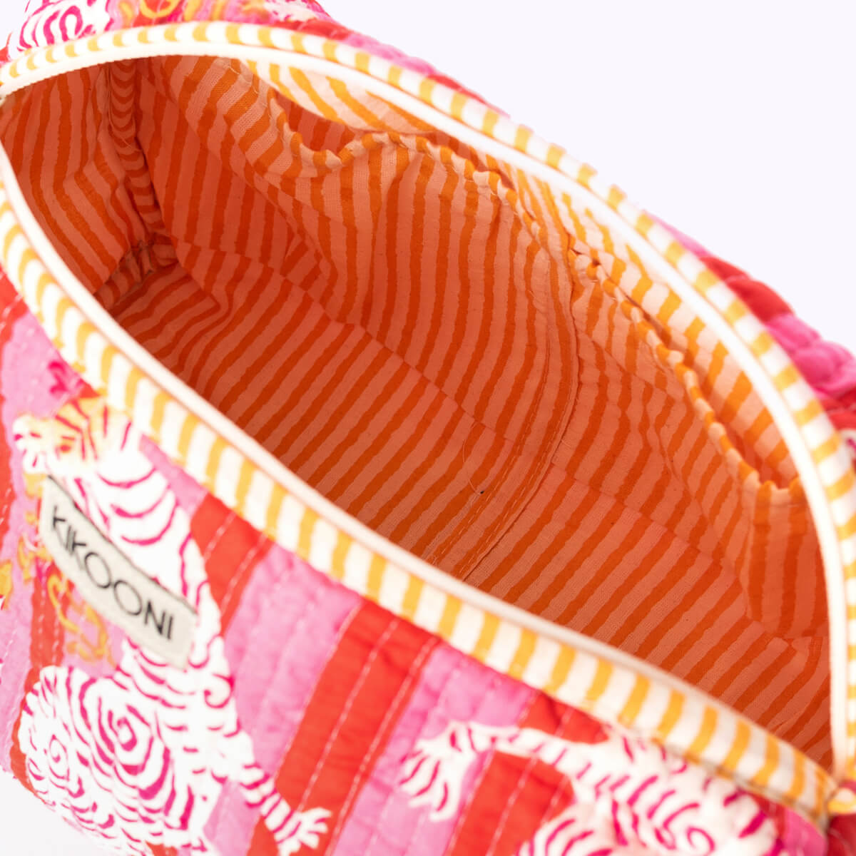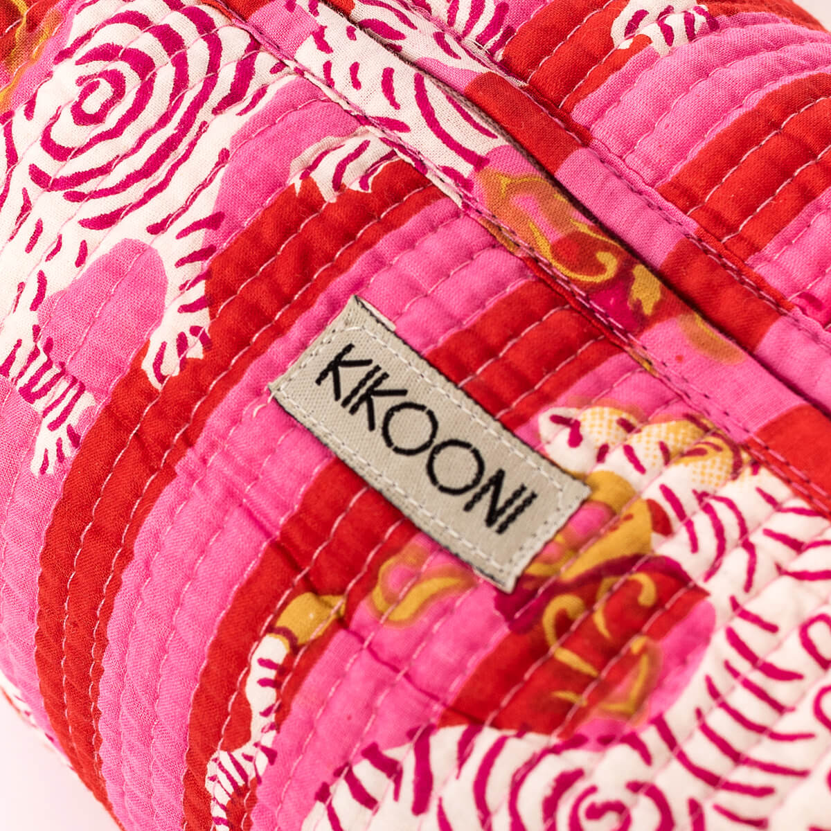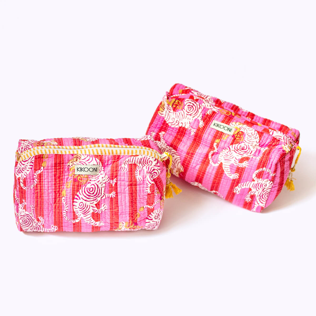 Liefdevol handwerk en unieke details! De speelse en handgemaakte toilettas "Mysty Dragon - Love" is een prachtige aanvulling op de grote (toilet)tas. Omdat je hem perfect in een handtas kunt opbergen, is hij ideaal om je must-haves zoals handcrème, lippenstift en zonnebrandcrème georganiseerd en binnen handbereik te bewaren. Het mooiste: elke toilettas is uniek en wordt met veel liefde in India gemaakt. De medewerkers bedrukken de pure katoenen stof met houten stempels met de hand. Dit proces wordt blockprint genoemd. Vervolgens wordt de tas geborduurd met het beroemde en traditionele Kantha-borduurwerk en afgewerkt met de kwastjesdetails aan de rits.