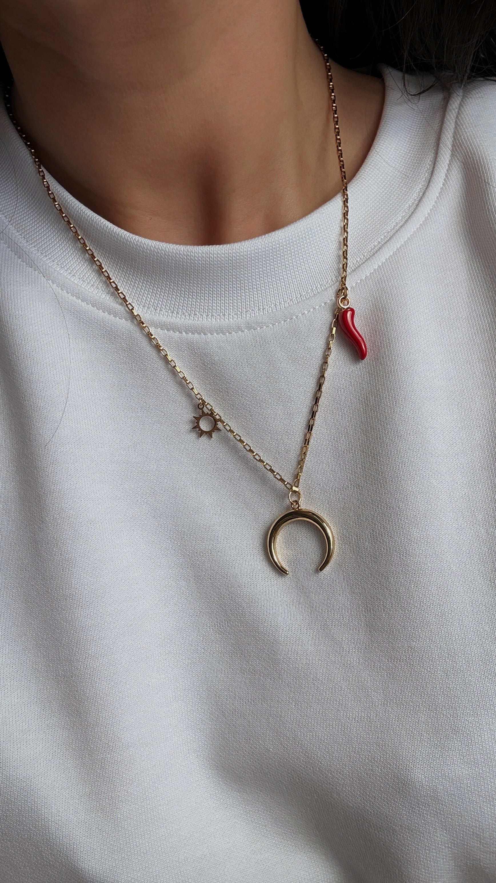 Handgemaakte ketting met trendy bedels. Dit is een uniek juweeltje, dit betekent dat er telkens maar 1 van elke soort is.