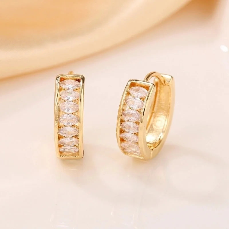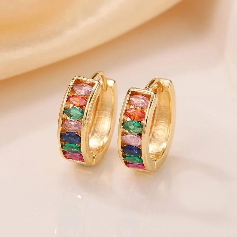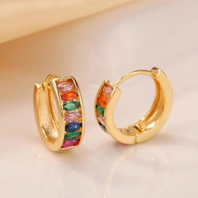 Goudkleurige hoops met fonkelende steentjes in rij gezet. Stijlvol en tijdloos, perfect voor elke gelegenheid. Te verkrijgen in 2 kleuren: met witte of gekleurde steentjes.